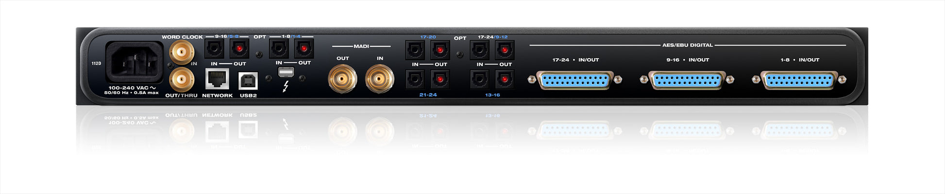 Three 8-channel (D-sub) banks of AES/EBU at sample rates up to 96 kHz. Three 8-channel banks of ADAT optical at rates up to 48 kHz; six banks of ADAT at 2x sample rates (24 channels).