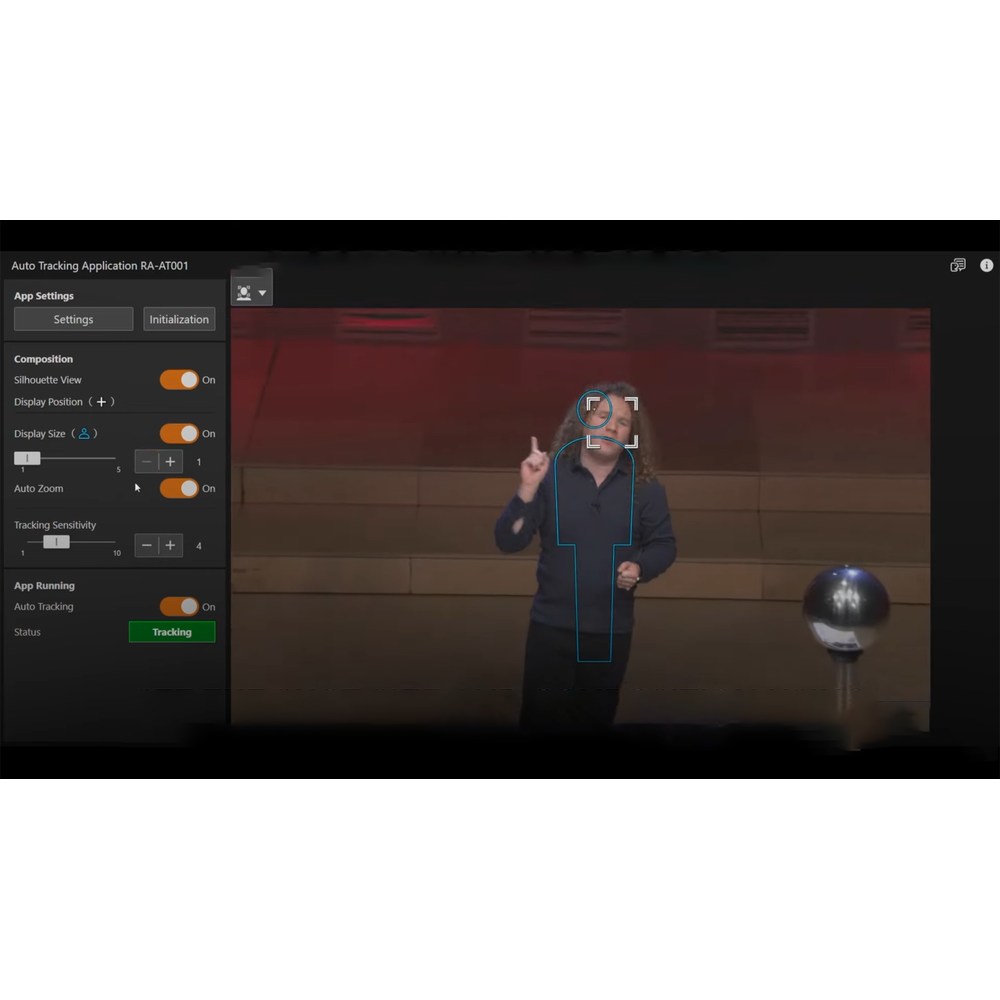 The Auto Tracking Application enables the camera to automatically track the speaker or other specified persons during commercial presentations, lectures and other events. The application is installed directly into the camera, eliminating the need for a computer to operate the software. Because visual analysis is performed in-camera, the system achieves excellent tracking capability. This empowers shooting with a multitude of framing options—from full-body, upper body, shoulders-up and other viewpoints—as well as following the movement of a subject moving at speeds ranging from slow to brisk walking. In addition to framing a person in the shot, the camera, aided by its high-performance pan/tilt mechanism and the automatic tracking application, can smoothly capture movements of people with satisfying quality for video production. What’s more, the application features a breadth of adjustment settings such as “Composition,” “Tracking Sensitivity,” and “Priority Display Area.”