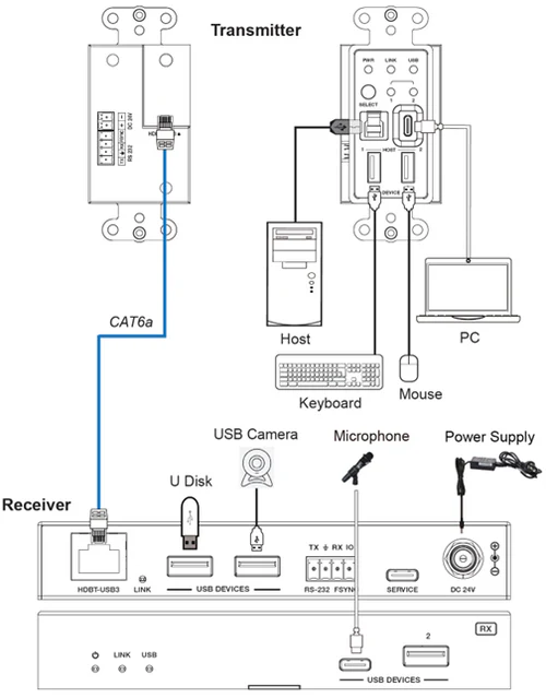 - Wall plate Tx features 1 x USB-C + 1 x USB-B selectable input ports and 2 x USB-A device ports