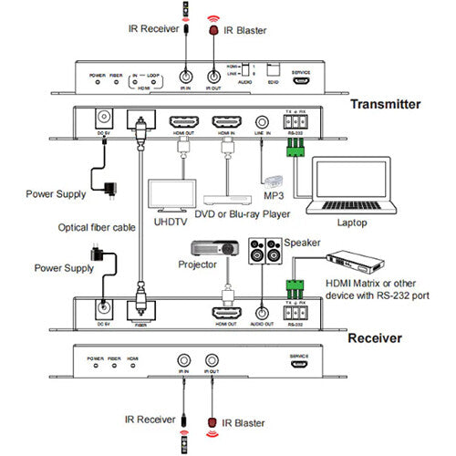 DVDO-HDMIFiber-1 is an extender that can transmit HDMI signals up to 33,000ft/10km through a single-mode fiber cable or 1,000ft/300m through a multi-mode fiber cable. It supports video resolutions up to 4K2K@60Hz 4:4:4. Transmitter supports loop output, audio embedding and EDID management function. Receiver supports audio extracting function. In addition, the extender supports bidirectional IR control and RS-232 signal pass-through. It can allow you to easily control the display device on the signal source side or control the signal source device on the display side when using this extender.