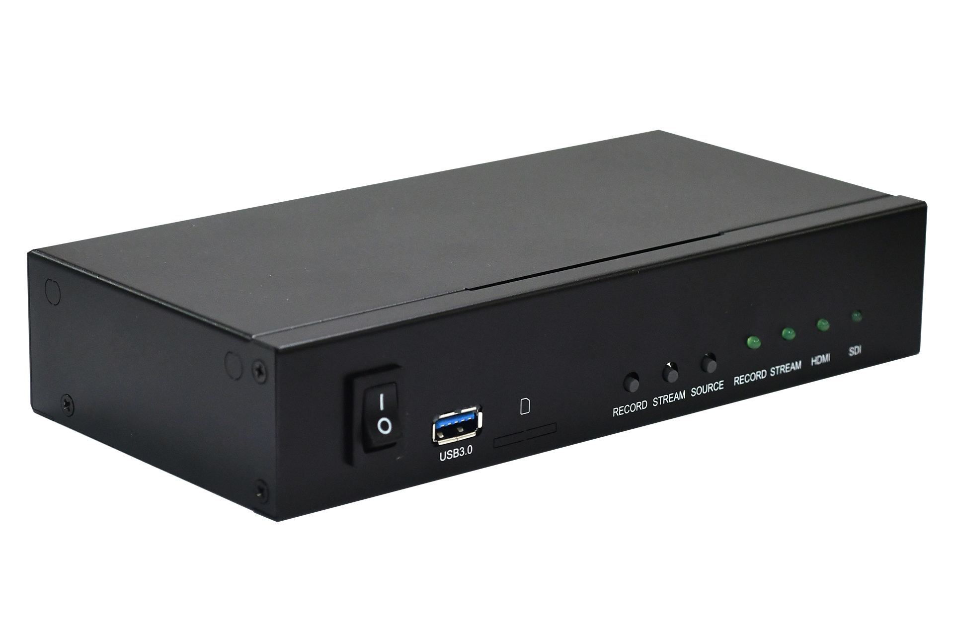 DVDO-StreamRec-1 is a single channel live streaming and recording system. It can stream incoming HDMI or SDI signals up to Full HD resolution to various streaming platforms such as Facebook Live, YouTube or others. It can also record incoming HDMI or SDI signals as well as IP content from the network on external storage devices via the USB 3.0 port on the front panel and play the content through the HDMI output. It can be controlled over IP with a user friendly web GUI. It also has physical buttons on the front panel to turn on and off streaming and recording and for source selection.