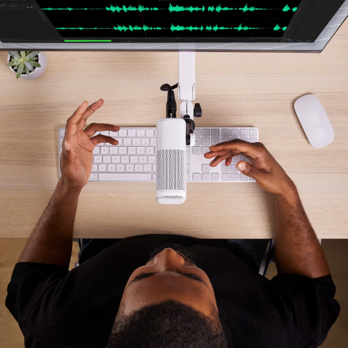 Mic Arm Pro floats below your shoulder line, so you always see your screen, and your audience always sees you.