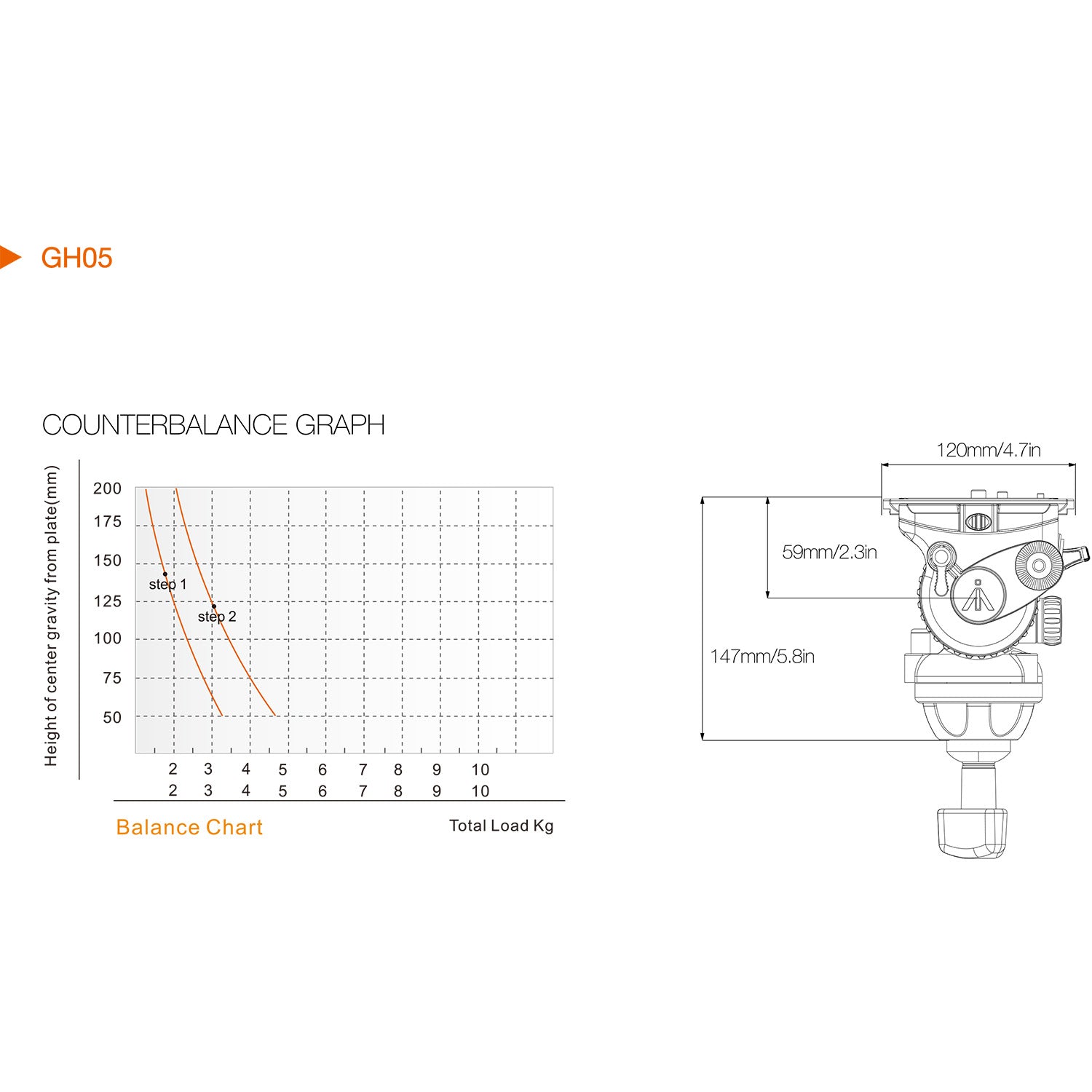 The GH05 Fluid Video Head has a max payload of 15.4 lbs., includes a GB2 pan handle and GP1 quick release plate, and fits into a 75mm bowl. Pan and Tilt drag are installed and fixed, and the counterbalance can be set to one of three different levels (0-2) via the dial on the back of the head. You get two rosettes for mounting pan handles, allowing you to mount the included handle on either side of the head or mount 2 handles simultaneously for extra control.