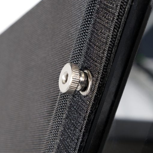 The PTZ teleprompter features a lightweight hood that fully encloses the PTZ camera, which allows it’s movement to remain unconstrained. The hood includes an opening in the back that gives you quick access to the PTZ cameras inputs and outputs. The opening can be closed with a drawstring which removes the possibility of any light leaks.