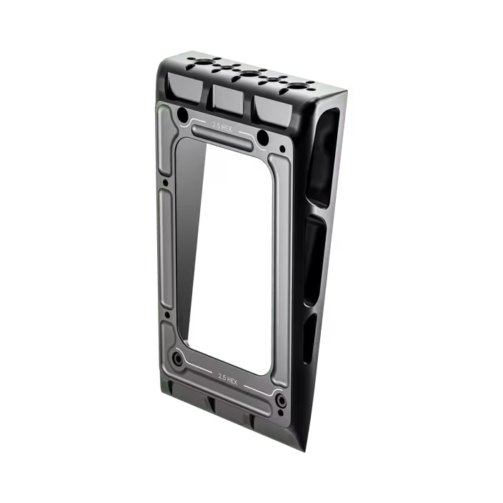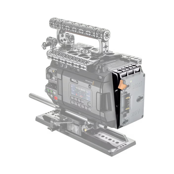 The Battery Plate Wedge positions the camera's battery plate perpendicular to the camera and attaches directly to the back of the camera with captive M2.5 screws. This allows the 26V Gold Mount Plus Battery Plate, or the Blackmagic URSA Cine 12K/17K Battery Plates to mount additional accessories in line with the camera setup, which is important when the battery plates have cradles or other accessories that extend the camera's length towards the back. The wedge has ¼”-20 and ⅜”-16 mounting points on top and complements the camera's body design.