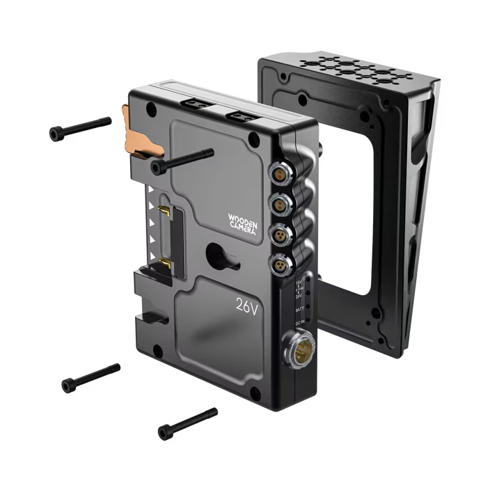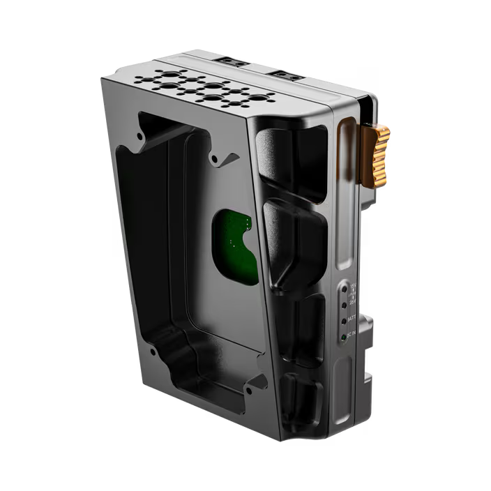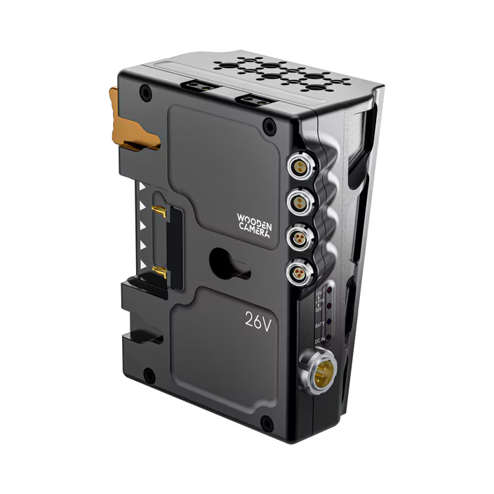 Add power and mounting options to the camera and your accessories with this 26V Gold Mount Plus D-Box™ and Wedge. With the included wedge, it mounts directly to the back of the camera and sets the camera's battery plate perpendicular to the camera, allowing the D-Box to mount battery plate accessories in line with your camera setup. In addition, ¼”-20 and ⅜”-16 mounting points are added to the top of the wedge for mounting accessories to the build.