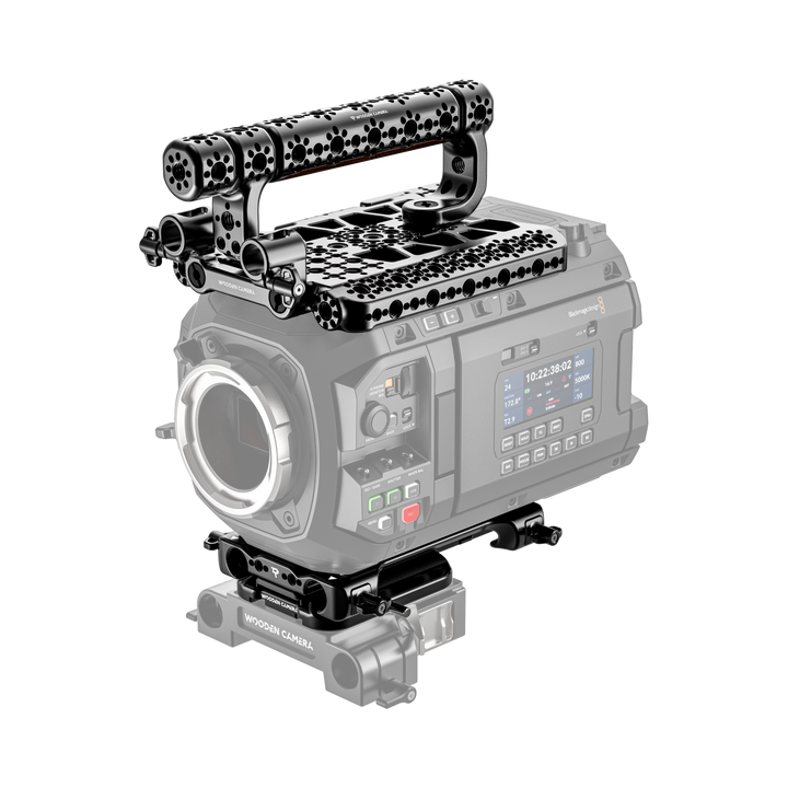 To enhance the capabilities of the camera, a Top Plate emphasizing air flow and connectivity is secured to the top of the camera via three ¼”-20 screws along the camera's center mounting points. In addition, a removable 15mm Dual rod clamp allows users to connect items like the Blackmagic EVF or additional 3rd party accessories. The design includes a removable rear extension for additional connecting points to the top plate. This Top Plate is compatible with the stock Blackmagic URSA handle.