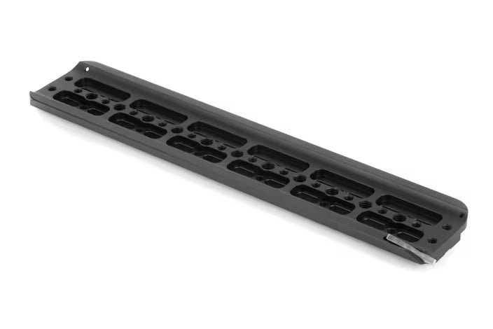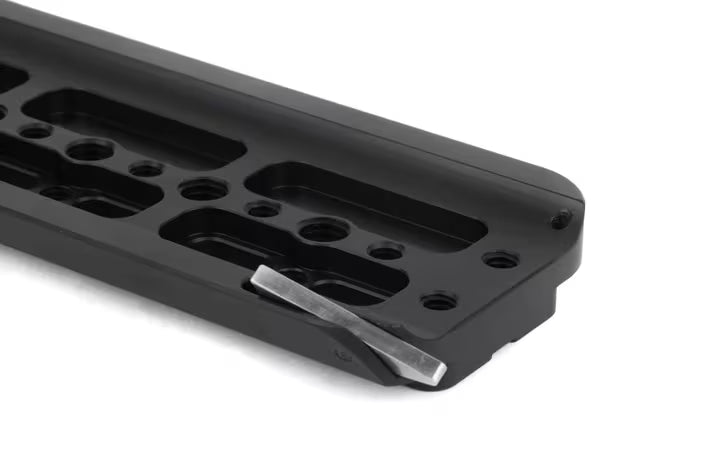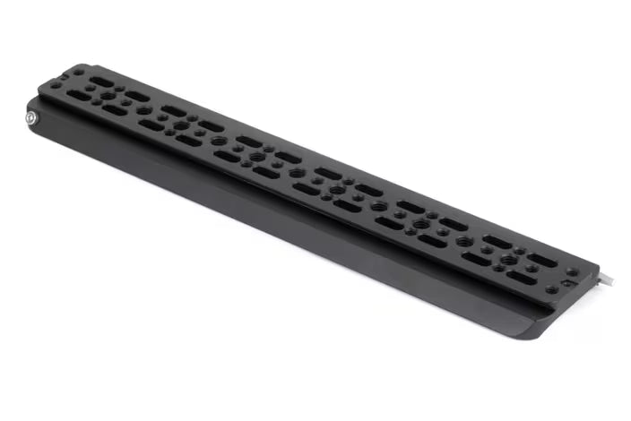 12" ARRI standard dovetail with safety catch on one end to prevent accidental camera removal. Threaded 1/4-20 and 3/8-16 holes for accessory mounting and tripod attachment. Attach to Shoulder Pad for custom handheld configurations